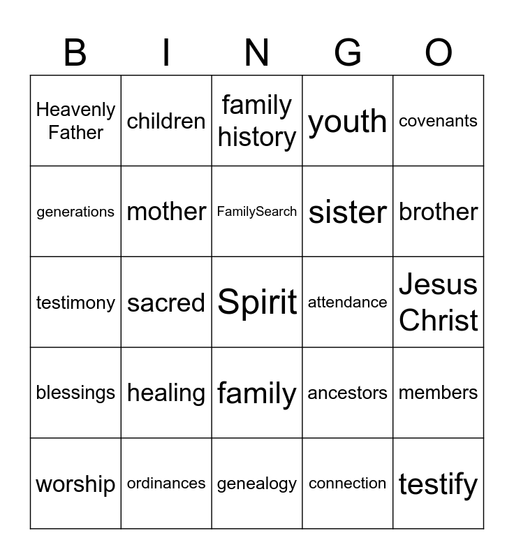 This bingo card has 38 words: doctrine, temple, priesthood, attendance, members, blessings, mother, father, sister, brother, generations, children, Spirit, ancestors, covenants, testimony, love, family history, joy, Jesus Christ, Heavenly Father, ordinances, FamilySearch, connection, gathering, names, work, genealogy, records, dedication, eternal, healing, family, youth, testify, worship, sacred and power.