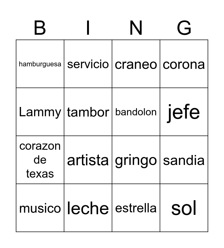 This bingo card has 35 words: maceta, rana, venado, bandolon, mano, corona, tambor, bandera, jefe, luna, gringo, Lammy, Herorina, reyna, hamburguesa, leche, rosa, sandia, sol, musico, Tex, luchador, cafesito, conchas, craneo, artista, ciudad del sol, chorizo, corazon de texas, estrella, san jacinto, bota, chico, servicio and pedro minero.