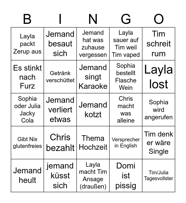 This bingo card has 26 words: Thema Hochzeit, Domi ist pissig, Jemand singt Karaoke, jemand küsst sich, Tim schreit rum, Layla packt Zerup aus, Es stinkt nach Furz, Jemand besaut sich, Sophia wird angerufen, Versprecher in English, Sophia bestellt Flasche Wein, Sophia oder Julia Jacky Cola, Tim denk er wäre Single, Jemand heult, Jemand verliert etwas, Tim vaped, Layla sauer auf Tim weil Tim vaped, Gibt Nix glutenfreies, Jemand hat was zuhause vergessen, Jemand kotzt, Layla lost, Layla macht Tim Ansage (draußen), Chris macht was alleine, Chris bezahlt, Getränk verschüttet and Tim/Julia Tagesvollster.