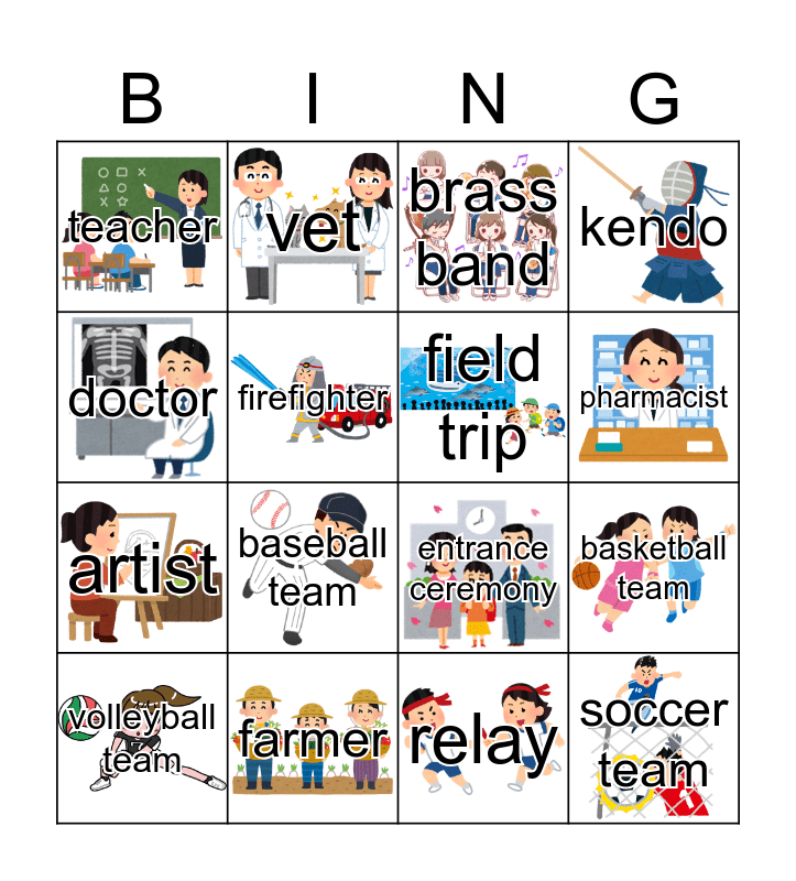 This bingo card has 24 images and 25 words: Free!, astronaut, pharmacist, soccer player, doctor, teacher, firefighter, vet, farmer, nurse, artist, entrance ceremony, camping trip, music festival, field trip, sleeping cat, relay, brass band, baseball team, basketball team, volleyball team, table tennis team, soccer team, kendo and science club.