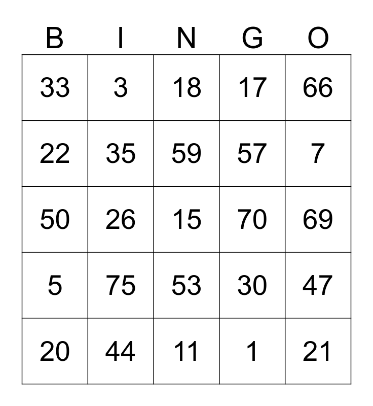 This bingo card has 25 words: 75, 11, 59, 20, 66, 33, 22, 3, 70, 53, 57, 50, 30, 47, 35, 21, 69, 18, 7, 26, 15, 44, 5, 17 and 1.
