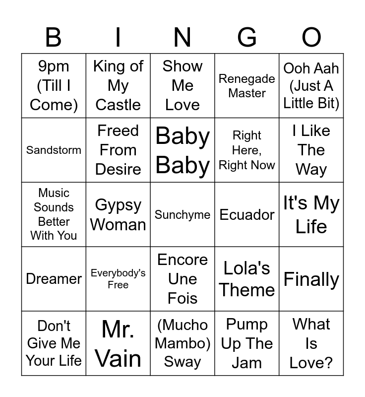 This bingo card has 40 words: Feel It, Music Sounds Better With You, The Key, The Secret, Freed From Desire, Mr. Vain, Encore Une Fois, Baby Baby, Missing, Ooh Aah (Just A Little Bit), Dreamer, Gypsy Woman, Renegade Master, Sunchyme, It's My Life, Ecuador, Everybody's Free, Children, 9pm (Till I Come), Lady - Hear Me Tonight, Show Me Love, Finally, Pump Up The Jam, Right Here, Right Now, Sandstorm, Chase The Sun, Another Night, Rhythm Is A Dancer, The Rhythm of the Night, What Is Love?, Better Off Alone, You're Not Alone, Don't Give Me Your Life, Turn Around, Lola's Theme, I Like The Way, (Mucho Mambo) Sway, Don't Call Me Baby, Another Chance, King of My Castle and It Feels So Good.