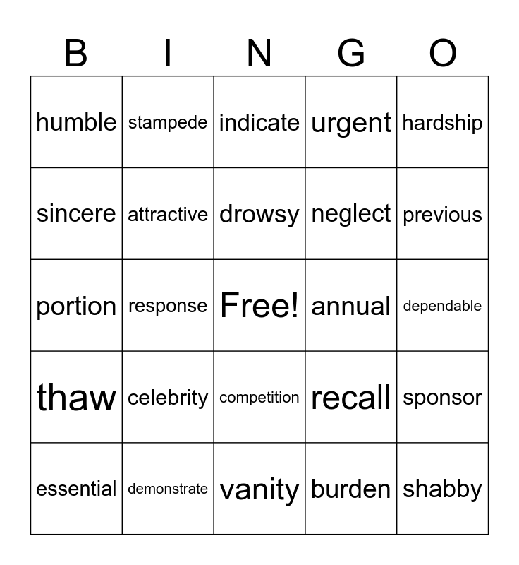 This bingo card has a free space and 24 words: celebrity, demonstrate, drowsy, essential, hardship, humble, sincere, stampede, annual, competition, neglect, portion, recall, sponsor, attractive, burden, dependable, indicate, previous, response, shabby, thaw, urgent and vanity.