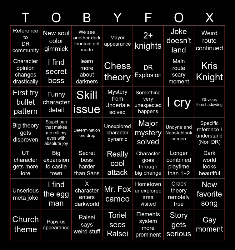 This bingo card has 49 words: Crack theory remotely true, Main route scary moment, Elements system more prominent, Stupid pun that makes me roll my eyes with absolute joy, Skill issue, Specific reference I understand (Non DR), New soul color gimmick, Ralsei says weird stuff, Joke doesn't land, Really cool attack, Weird route continued, Mayor appearance, I cry, Something very unexpected happens, I find the egg man, Undyne and Napstablook cameo, Character opinion changes drastically, Kris Knight, New favorite song, 2+ knights, DR Explosion, Determination lore drop, Reference to DR community, I find secret boss, Church theme, learn more about darkners, Obvious foreshadowing, Papyrus appearance, Mystery from Undertale solved, Funny character detail, Gay moment, Major mystery solved, Unserious meta joke, X character enters darkworld, Big theory gets disproven, Character goes through big change, Longer combined playtime than 1+2, Dark world looks beautiful, First try bullet pattern, Secret boss harder than Sans, Mr. Fox cameo, UT character gets more lore, Unexplored character dynamic, Toriel sees Ralsei, Chess theory, We see another dark fountain get made, Hometown unexplored area visited, Big expansion to castle town and Story gets serious.