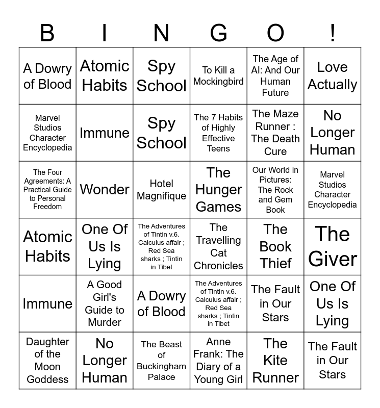 ⚠ This card has duplicate items: Daughter of the Moon Goddess (2), Spaceboy (2), One Of Us Is Lying (2), The Adventures of Tintin v.6. Calculus affair ; Red Sea sharks ; Tintin in Tibet (2), Rebel Fire (2), Atomic Habits (2), The Maze Runner : The Death Cure (2), Immune (2), A Short History of Nearly Everything (2), Marvel Studios Character Encyclopedia (2), Wonder (2), Hotel Magnifique (2), The Age of AI: And Our Human Future (2), The Beast of Buckingham Palace (2), Love Actually (2), No Longer Human (2), A Dowry of Blood (2), The Travelling Cat Chronicles (2), Spy School (2), Our World in Pictures: The Rock and Gem Book (2), The Hunger Games (2), To Kill a Mockingbird (2), The Giver (2), The Book Thief (2), The Fault in Our Stars (2), Anne Frank: The Diary of a Young Girl (2), The Lightning Thief (2), The 7 Habits of Highly Effective Teens (2), A Good Girl's Guide to Murder (2), The Four Agreements: A Practical Guide to Personal Freedom (2), The Kite Runner (2)