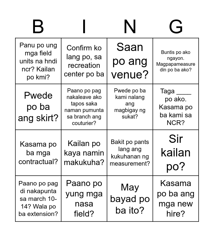 This bingo card has 16 words: Paano po yung mga nasa field?, Sir kailan po?, Saan po ang venue?, Panu po ung mga field units na hndi ncr? Kailan po kmi?, Kasama po ba mga contractual?, Confirm ko lang po, sa recreation center po ba, Bakit po pants lang ang kukuhanan ng measurement?, May bayad po ba ito?, Pwede po ba ang skirt?, Paano po pag nakaleave ako tapos saka naman pumunta sa branch ang couturier?, Paano po pag di nakapunta sa march 10-14? Wala po ba extension?, Buntis po ako ngayon. Magpapameasure din po ba ako?, Kailan po kaya namin makukuha?, Taga ____ po ako. Kasama po ba kami sa NCR?, Pwede po ba kami nalang ang magbigay ng sukat? and Kasama po ba ang mga new hire?.