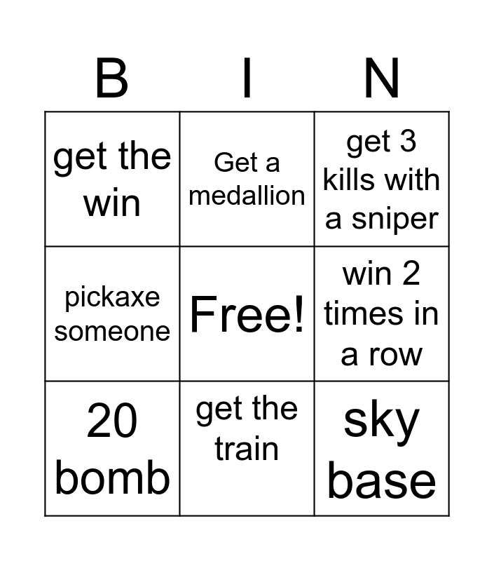 This bingo card has a free space and 8 words: win 2 times in a row, get 3 kills with a sniper, Get a medallion, 20 bomb, get the win, sky base, pickaxe someone and get the train.