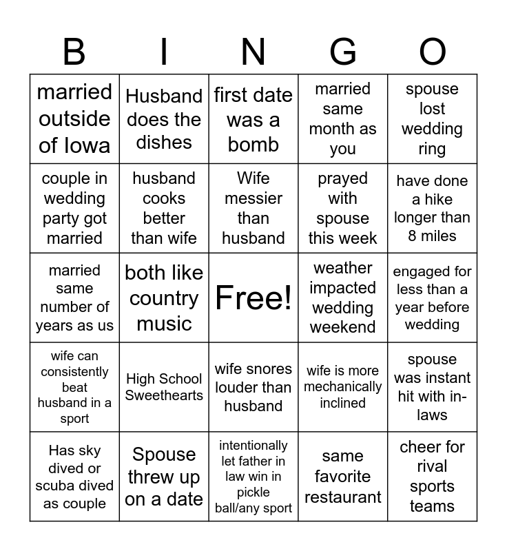This bingo card has a free space and 24 words: High School Sweethearts, Spouse threw up on a date, Wife messier than husband, Has sky dived or scuba dived as couple, spouse lost wedding ring, married outside of Iowa, couple in wedding party got married, Husband does the dishes, weather impacted wedding weekend, wife snores louder than husband, prayed with spouse this week, married same number of years as us, wife is more mechanically inclined, spouse was instant hit with in-laws, husband cooks better than wife, same favorite restaurant, engaged for less than a year before wedding, first date was a bomb, have done a hike longer than 8 miles, both like country music, cheer for rival sports teams, wife can consistently beat husband in a sport, married same month as you and intentionally let father in law win in pickle ball/any sport.