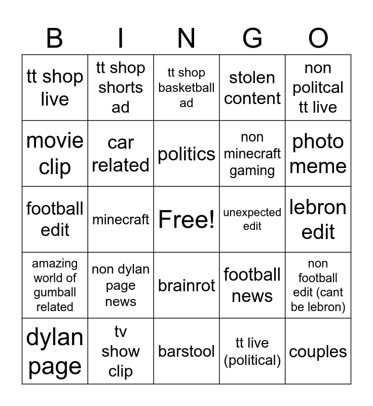 This bingo card has a free space and 24 words: dylan page, non dylan page news, politics, tt live (political), non politcal tt live, tt shop live, tt shop shorts ad, tt shop basketball ad, unexpected edit, lebron edit, football edit, car related, football news, non football edit (cant be lebron), movie clip, tv show clip, barstool, stolen content, photo meme, amazing world of gumball related, minecraft, brainrot, non minecraft gaming and couples.