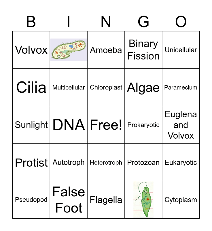 This bingo card has 4 images, a free space and 33 words: Contractile Vacuole, Photosynthesis, Amoeba, Paramecium and Euglena, Multicellular, Eukaryotic, Autotroph, Chloroplast, Euglena, Unicellular, Sexual Reproduction, DNA, Binary Fission, Cytoplasm, Euglena and Volvox, Cilia, Protist, Eyespot, Amoeba, Heterotroph, Prokaryotic, Volvox, Paramecium, Pseudopod, Flagella, Nucleus, Tail, Hair, False Foot, Sunlight, 2 nuclei, Protozoan, Algae and Vacuole.
