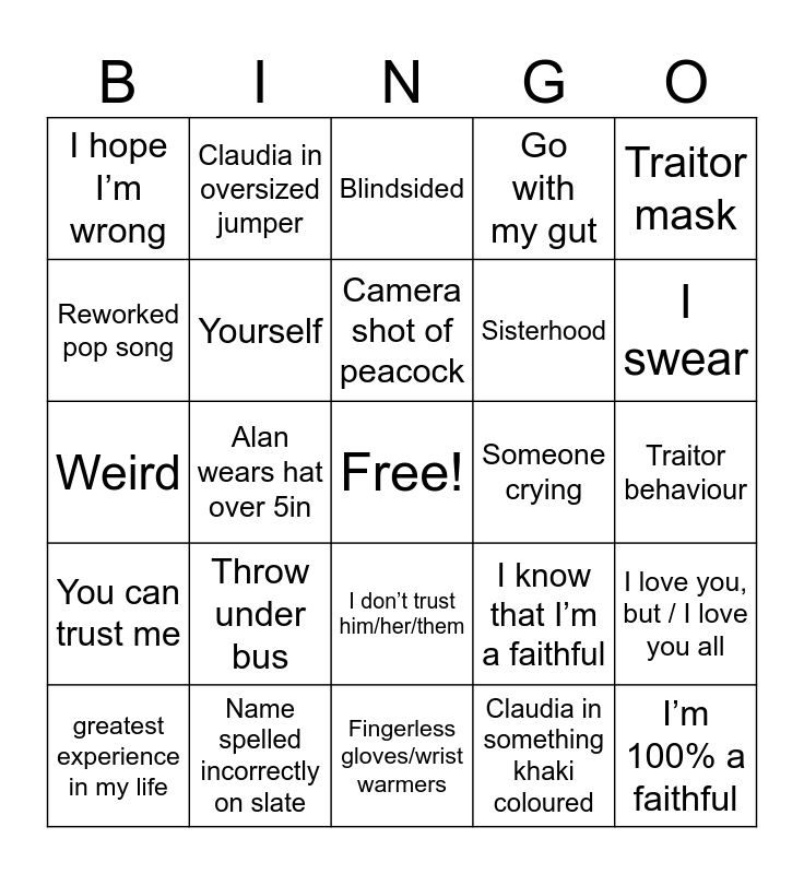 This bingo card has a free space and 27 words: 100%, Name spelled incorrectly on slate, Camera shot of peacock, Claudia in something khaki coloured, Traitor mask, Reworked pop song, Claudia in oversized jumper, Fingerless gloves/wrist warmers, Someone crying, I love you, but / I love you all, You can trust me, Yourself, I know that I’m a faithful, I’m 100% a faithful, Weird, Look me in the eye, Blindsided, Go with my gut, Traitor behaviour, I hope I’m wrong, Throw under bus, I don’t trust him/her/them, Sisterhood, I swear, greatest experience in my life, Alan wears hat over 5in and Alan wears gay Scottish outfit.