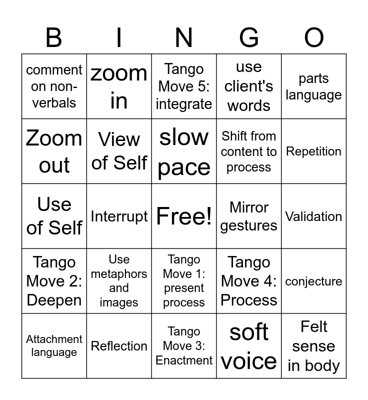 This bingo card has a free space and 26 words: Tango Move 1: present process, soft voice, slow pace, Reflection, parts language, comment on non-verbals, Zoom out, zoom in, Validation, Tango Move 4: Process, Shift from content to process, Use of Self, conjecture, Attachment language, Interrupt, Reframe, use client's words, Tango Move 2: Deepen, Tango Move 5: integrate, Felt sense in body, Repetition, Tango Move 3: Enactment, Mirror gestures, Use metaphors and images, View of Self and View of Other.