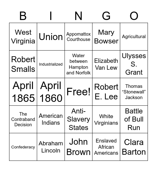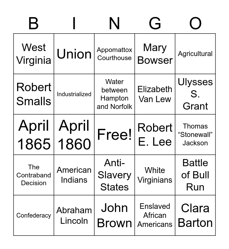 This bingo card has a free space and 33 words: Abolitionists, Nat Turner, April 1860, Harriet Tubman, The Contraband Decision, Industrialized, Agricultural, Confederacy, Union, Draw, Water between Hampton and Norfolk, Appomattox Courthouse, Seceded, Richmond, Robert E. Lee, Ulysses S. Grant, Abraham Lincoln, April 1865, American Indians, White Virginians, Anti-Slavery States, Pro-Slavery States, West Virginia, Thomas “Stonewall” Jackson, John Brown, Clara Barton, Mary Bowser, Elizabeth Van Lew, Robert Smalls, Battle of Bull Run, Battle of Fredericksburg, Enslaved African Americans and Freed African Americans.