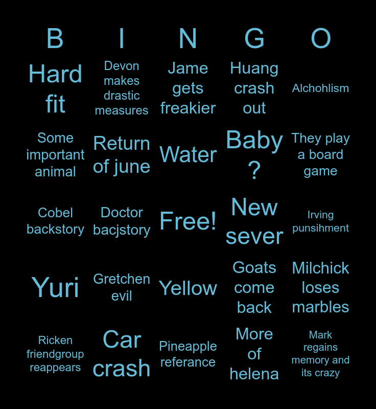 This bingo card has a free space and 24 words: Gretchen evil, Car crash, Water, Ricken friendgroup reappears, Alchohlism, Hard fit, Some important animal, Devon makes drastic measures, New sever, Yellow, Baby ?, Cobel backstory, Goats come back, Milchick loses marbles, Return of june, More of helena, Irving punsihment, Jame gets freakier, They play a board game, Doctor bacjstory, Mark regains memory and its crazy, Yuri, Huang crash out and Pineapple referance.