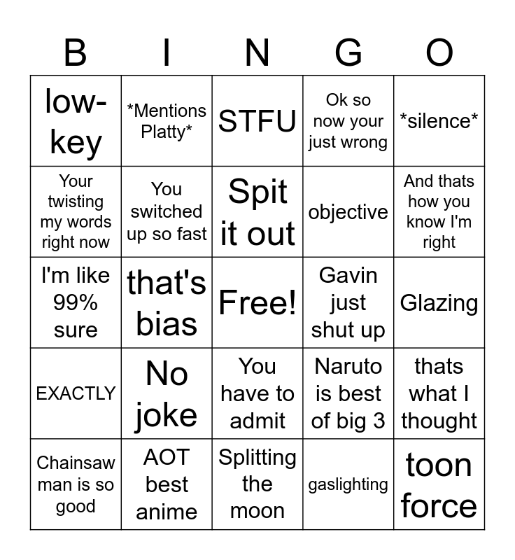 This bingo card has a free space and 37 words: I'm Not gonna Lie, Ok so now your just lying (starts chuckling), Coyotes, Gavin just shut up, Glazing, EXACTLY, that's bias, subjective, objective, To be fair, Your twisting my words right now, You switched up so fast, gaslighting, *silence*, low-key, AOT best anime, You have to admit, Ok so now your just wrong, And thats how you know I'm right, l'm like 99% sure, *Mentions Platty*, Spit it out, St-st-st-stuttering, thats what I thought, Private Call, Bringing up the past, STFU, Your such hypocrite, Ask anyone, Changes topic, Na you right, Splitting the moon, Naruto is best of big 3, toon force, Chainsaw man is so good, No joke and I dont care.