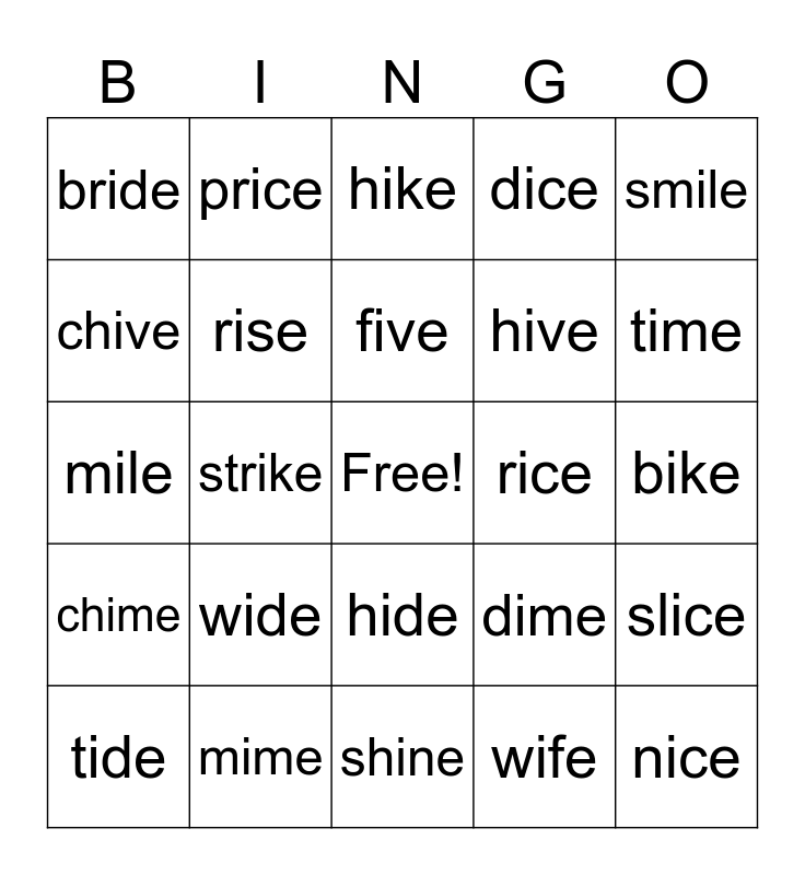 This bingo card has a free space and 44 words: ice, nice, twice, tide, pride, wife, hike, file, smile, mime, dice, rice, hide, wide, slide, shine, like, mile, while, time, price, lice, ride, bride, stride, bike, spike, pile, dime, chime, mice, slice, glide, life, strike, tile, lime, grime, five, chive, hive, drive, rise and bride.