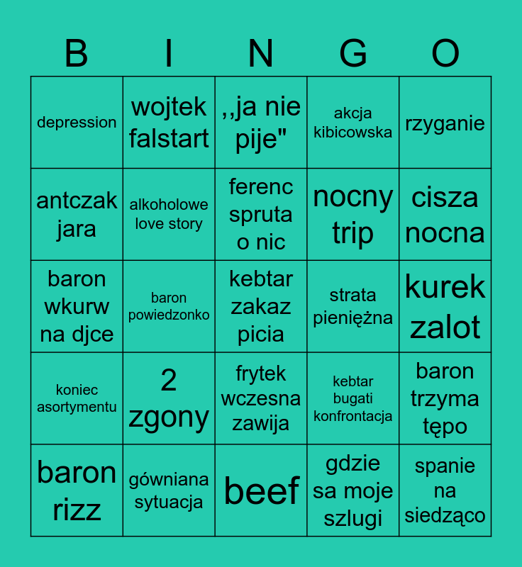 This bingo card has a free space and 24 words: 2 zgony, gówniana sytuacja, ferenc spruta o nic, baron rizz, rzyganie, depression, antczak jara, wojtek falstart, strata pieniężna, frytek wczesna zawija, nocny trip, baron wkurw na djce, kebtar bugati konfrontacja, baron trzyma tępo, alkoholowe love story, gdzie sa moje szlugi, kurek zalot, ,,ja nie pije", cisza nocna, baron powiedzonko, spanie na siedząco, koniec asortymentu, akcja kibicowska and beef.