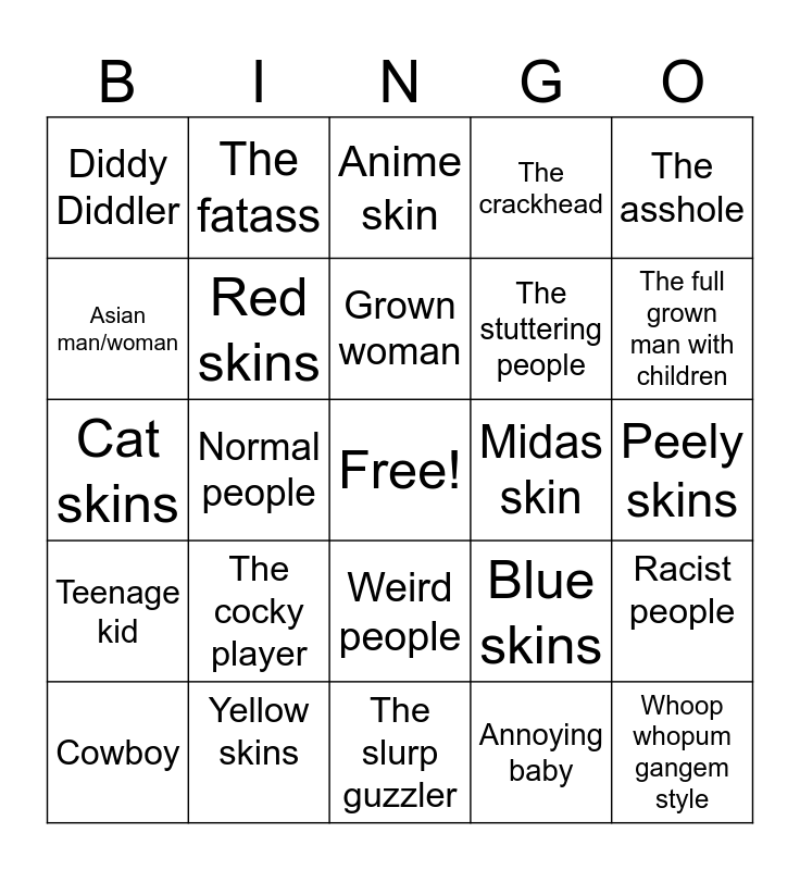 This bingo card has a free space and 24 words: Cowboy, The cocky player, Grown woman, Annoying baby, The asshole, Diddy Diddler, The fatass, Anime skin, Midas skin, Peely skins, Cat skins, Red skins, Blue skins, Racist people, Asian man/woman, Yellow skins, The slurp guzzler, The crackhead, The full grown man with children, Teenage kid, Normal people, Weird people, The stuttering people and Whoop whopum gangem style.
