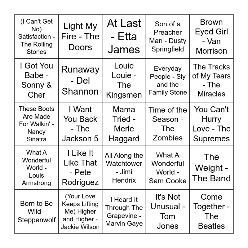 This bingo card has 61 words: King of the Road - Roger Miller, (Your Love Keeps Lifting Me) Higher and Higher - Jackie Wilson, Crying - Roy Orbison, What A Wonderful World - Louis Armstrong, It's Not Unusual - Tom Jones, Daydream Believer - The Monkees, Runaway - Del Shannon, Unchained Melody - Righteous Brothers, Everyday People - Sly and the Family Stone, To Love Somebody - Bee Gees, Son of a Preacher Man - Dusty Springfield, Suspicious Minds - Elvis Presley, I Got You Babe - Sonny & Cher, Uptight (Everything's Alright) - Stevie Wonder, Under the Boardwalk - The Drifters, (I Can't Get No) Satisfaction - The Rolling Stones, Mama Tried - Merle Haggard, Brown Eyed Girl - Van Morrison, You Really Got Me - The Kinks, Louie Louie - The Kingsmen, Time of the Season - The Zombies, At Last - Etta James, Born to Be Wild - Steppenwolf, The Weight - The Band, Crazy - Patsy Cline, Space Oddity - David Bowie, Ring of Fire - Johnny Cash, Fist City - Loretta Lynn, The Tracks of My Tears - The Miracles, Turn! Turn! Turn! - The Byrds, Leader of the Pack - The Shangri-Las, Stand By Your Man - Tammy Wynette, Sunshine of Your Love - Cream, For What It's Worth - Buffalo Springfield, Light My Fire - The Doors, Green Onions - Booker T. & The MG's, Piece of My Heart - Big Brother & The Holding Company and Janis Joplin, I Want You Back - The Jackson 5, California Dreamin' - The Mamas & The Papas, These Boots Are Made For Walkin' - Nancy Sinatra, Can't Take My Eyes off You - Frankie Valli and the Four Seasons, I Like It Like That - Pete Rodriguez, You Can't Hurry Love - The Supremes, My Way - Frank Sinatra, What A Wonderful World - Sam Cooke, Fortunate Son - Creedence Clearwater Revival, Somebody to Love - Jefferson Airplane, Sweet Caroline - Neil Diamond, Georgia on My Mind - Ray Charles, All Along the Watchtower - Jimi Hendrix, I Heard It Through The Grapevine - Marvin Gaye, Dancing in the Street - Martha and the Vandellas, (Sittin' On) the Dock of the Bay - Otis Redding, My Generation - The Who, Be My Baby - The Ronettes, My Girl - The Temptations, I Got You (I Feel Good) - James Brown, (You Make Me Feel Like) a Natural Woman - Aretha Franklin, Good Vibrations - The Beach Boys, Come Together - The Beatles and Come a Little Bit Closer - Jay and the Americans.