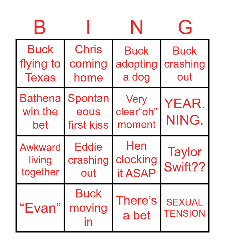 This bingo card has 16 words: Buck moving in, Taylor Swift??, Buck adopting a dog, Buck flying to Texas, Awkward living together, Chris coming home, Hen clocking it ASAP, There’s a bet, Bathena win the bet, Spontan eous first kiss, “Evan”, Buck crashing out, Eddie crashing out, YEAR. NING., Very clear“oh” moment and SEXUAL TENSION.