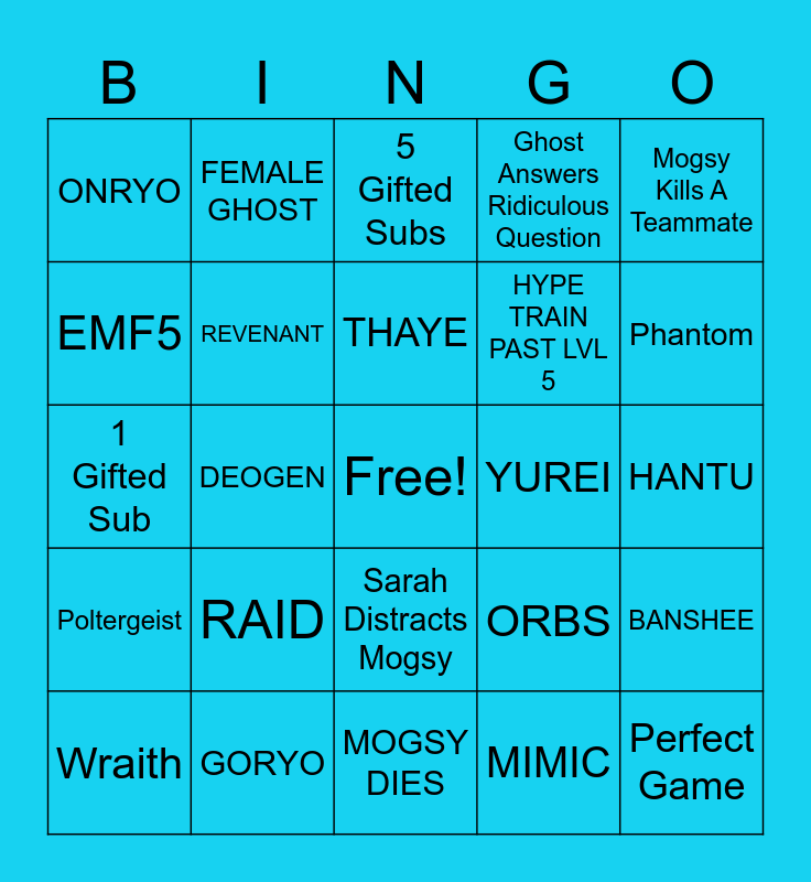 This bingo card has a free space and 48 words: Moroi, Perfect Game, DEMON, MOGSY DIES, RAID, Mogsy Facepalmed at pun, FEMALE GHOST, THE TWINS, EMF5, MOGSY GOT JUMPSCARED, REVENANT, Ghost Answers Ridiculous Question, BANSHEE, ORBS, Mogsy Takes A Bathroom Break, Mogsy Guessed Wrong, THAYE, YUREI, MALE GHOST, Mogsy Kills A Teammate, DEOGEN, MIMIC, ONRYO, HYPE TRAIN PAST LVL 5, Fingerprints, Phantom, Wraith, Ghost Writing, Sarah Distracts Mogsy, Poltergeist, Mogsy Gets Stuck, Freezing Temps, OBAKE, RAIJU, GORYO, SPIRIT BOX, 3 Star Ghost Photo, HANTU, Crucifix Saves Mogsy, JINN, MYLING, DOTS, 5 Gifted Subs, 500 Bits, 1 Gifted Sub, 100 Bits, Hype Train Past LVL 3 and Mogsy mentions RAAAAID SHADOW LEGENDS.