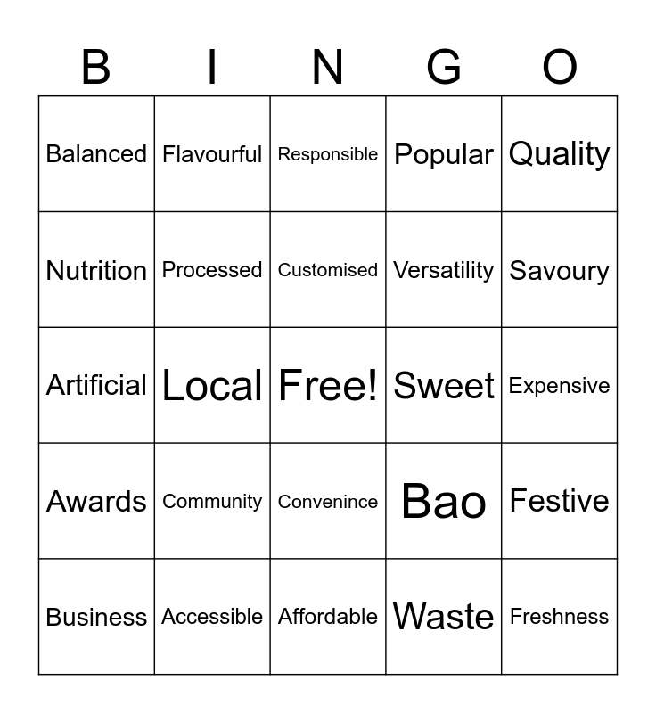 This bingo card has a free space and 27 words: Bao, Bun, Versatility, Affordable, Nutrition, Responsible, Flavourful, Awards, Sweet, Festive, Artificial, Popular, Business, Accessible, Savoury, Recyclable, Processed, Customised, Community, Balanced, Expensive, Waste, Local, Freshness, Convenince, Quality and Bland.