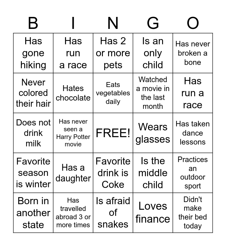 This bingo card has a free space and 69 words: Born outside of Chile, Has taken dance lessons, Loves reading novels, Is new in the school, Has travelled abroad 3 or more times, Likes juice over soda, Is an only child, Likes music that isn't in English nor Spanish, Has never broken a bone, Last name starts with M, Practices an outdoor sport, Had/Has Braces, Has gone hiking, Has 2 or more pets, Played a sport in middle school, Has never seen a Harry Potter movie, Favorite drink is Coke, Watched a movie in the last month, Spends a lot of time on tiktok, Favorite season is winter, Wears glasses, Is the middle child, Has run a race, Has lived in a different city/country, Likes to read, Has taken piano lessons, Sings in a choir, Has built a website, Loves finance, wants to be an entrepreneur, Has run a race, Has eaten a really hot pepper, hates sushi, Born in the summer, Is the youngest in family, Has had stitches, Has green eyes, Has naturally straight hair, Never colored their hair, Wears contacts, Has a daughter, Didn't make their bed today, Met with a career coach, has pierced ears, Favorite pizza is cheese, Born in another state, Is left handed, More than two siblings, Did not have soda today, Hates chocolate, Eats vegetables daily, Walked to school, Ate school lunch today, Is afraid of snakes, Knows how to sew, Favorite color is purple, Made your bed today, Does not like chocolate, Hates vegtables, Does not drink milk, Had braces, Was born in December, Chooses salty over sweet, Writes poetry, Can braid their own hair, Can whistle, Is not ticklish, Has allergies and Favorite flower is a rose.