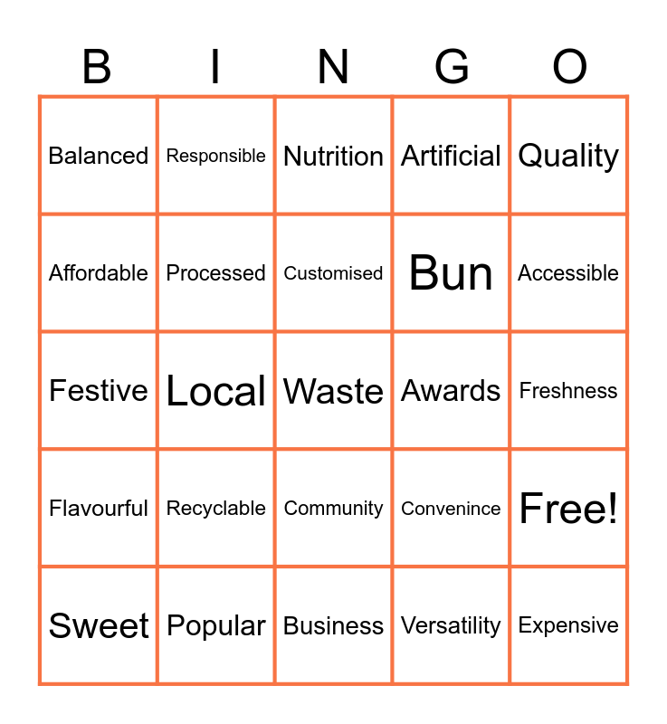 This bingo card has 28 words: Free!, Bao, Bun, Versatility, Affordable, Nutrition, Responsible, Flavourful, Awards, Sweet, Festive, Artificial, Popular, Business, Accessible, Savoury, Recyclable, Processed, Customised, Community, Balanced, Expensive, Waste, Local, Freshness, Convenince, Quality and Bland.
