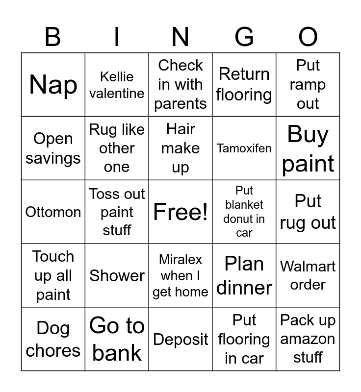 This bingo card has a free space and 24 words: Dog chores, Shower, Hair make up, Put flooring in car, Put ramp out, Nap, Kellie valentine, Check in with parents, Put blanket donut in car, Put rug out, Ottomon, Rug like other one, Plan dinner, Walmart order, Open savings, Go to bank, Deposit, Return flooring, Buy paint, Touch up all paint, Toss out paint stuff, Miralex when I get home, Tamoxifen and Pack up amazon stuff.