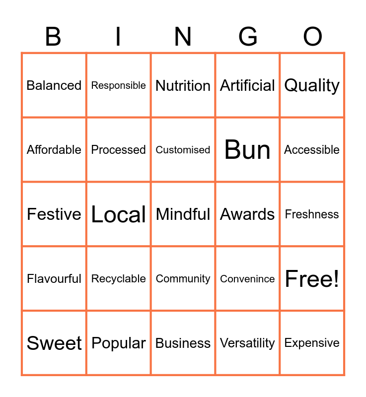This bingo card has 28 words: Free!, Bao, Bun, Versatility, Affordable, Nutrition, Responsible, Flavourful, Awards, Sweet, Festive, Artificial, Popular, Business, Accessible, Savoury, Recyclable, Processed, Customised, Community, Balanced, Expensive, Mindful, Local, Freshness, Convenince, Quality and Bland.