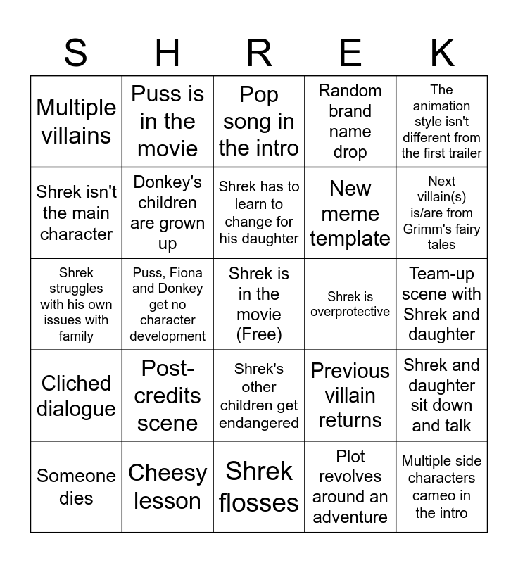 This bingo card has a free space and 24 words: Post-credits scene, Cheesy lesson, Shrek has to learn to change for his daughter, Someone dies, The animation style isn't different from the first trailer, Multiple villains, Shrek isn't the main character, Puss is in the movie, Shrek is overprotective, Shrek's other children get endangered, New meme template, Shrek struggles with his own issues with family, Previous villain returns, Shrek and daughter sit down and talk, Donkey's children are grown up, Plot revolves around an adventure, Team-up scene with Shrek and daughter, Pop song in the intro, Next villain(s) is/are from Grimm's fairy tales, Puss, Fiona and Donkey get no character development, Multiple side characters cameo in the intro, Cliched dialogue, Random brand name drop and Shrek flosses.
