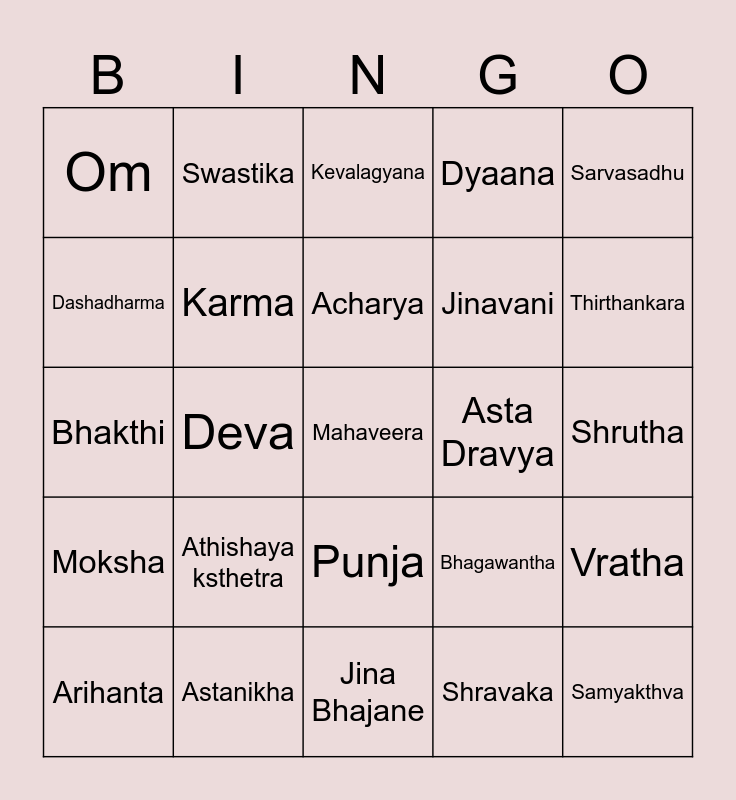 This bingo card has 30 words: Arihanta, Sidda, Acharya, Upadhyay, Sarvasadhu, Om, Swastika, Punja, Asta Dravya, Samyakthva, Moksha, Karma, Free!, Shravaka, Vratha, Jina, Deva, Mahaveera, Bhagawantha, Thirthankara, Bhakthi, Astanikha, Kevalagyana, Jinavani, Shrutha, Dashadharma, Athishaya ksthetra, Jina Bhajane, Dyaana and Ahimse.