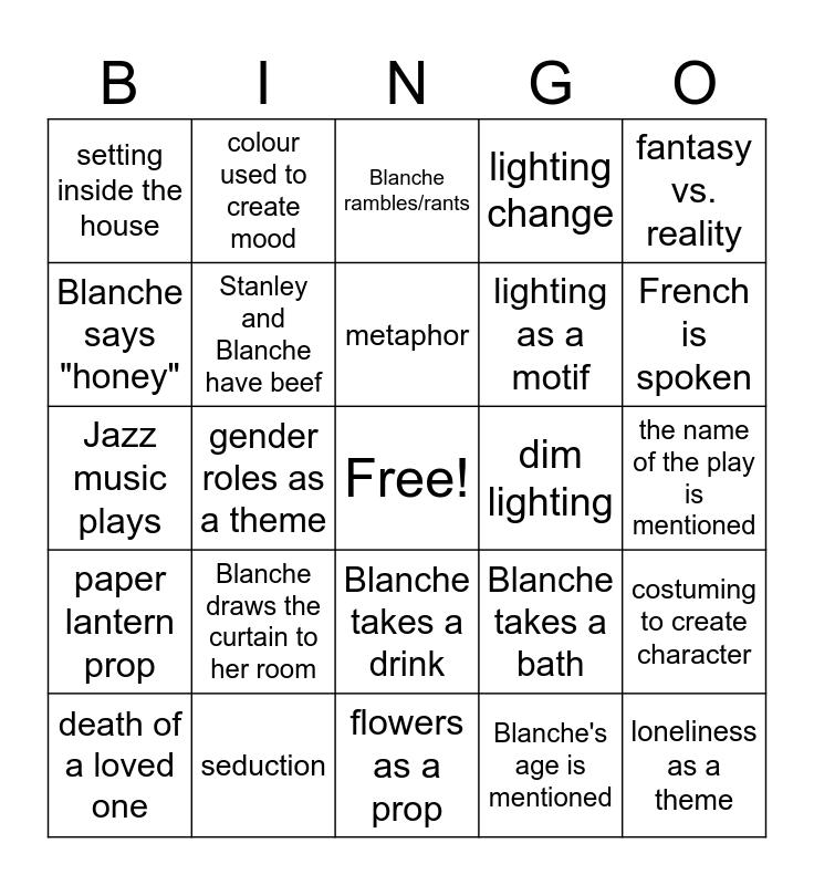 This bingo card has a free space and 29 words: death of a loved one, audience laughs, gender roles as a theme, Mitch is awkward, setting inside the house, Blanche rambles/rants, Stanley and Blanche have beef, Blanche draws the curtain to her room, dim lighting, seduction, the name of the play is mentioned, loneliness as a theme, flowers as a prop, Blanche's age is mentioned, French is spoken, youth versus age, Blanche takes a drink, paper lantern prop, fantasy vs. reality, Jazz music plays, Blanche takes a bath, simile, lighting as a motif, Blanche says "honey", lighting change, colour used to create mood, costuming to create character, metaphor and blue piano.