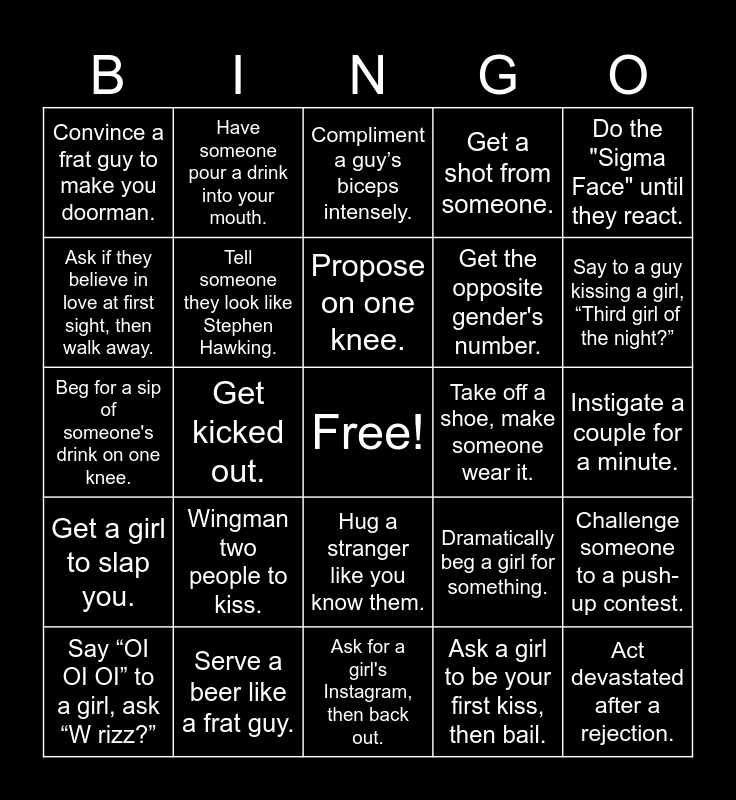 This bingo card has a free space and 24 words: Wingman two people to kiss., Serve a beer like a frat guy., Propose on one knee., Say “OI OI OI” to a girl, ask “W rizz?”, Do the "Sigma Face" until they react., Convince a frat guy to make you doorman., Ask if they believe in love at first sight, then walk away., Have someone pour a drink into your mouth., Take off a shoe, make someone wear it., Hug a stranger like you know them., Get the opposite gender's number., Beg for a sip of someone's drink on one knee., Dramatically beg a girl for something., Challenge someone to a push-up contest., Tell someone they look like Stephen Hawking., Ask a girl to be your first kiss, then bail., Instigate a couple for a minute., Compliment a guy’s biceps intensely., Say to a guy kissing a girl, “Third girl of the night?”, Get kicked out., Act devastated after a rejection., Get a girl to slap you., Get a shot from someone. and Ask for a girl's Instagram, then back out..