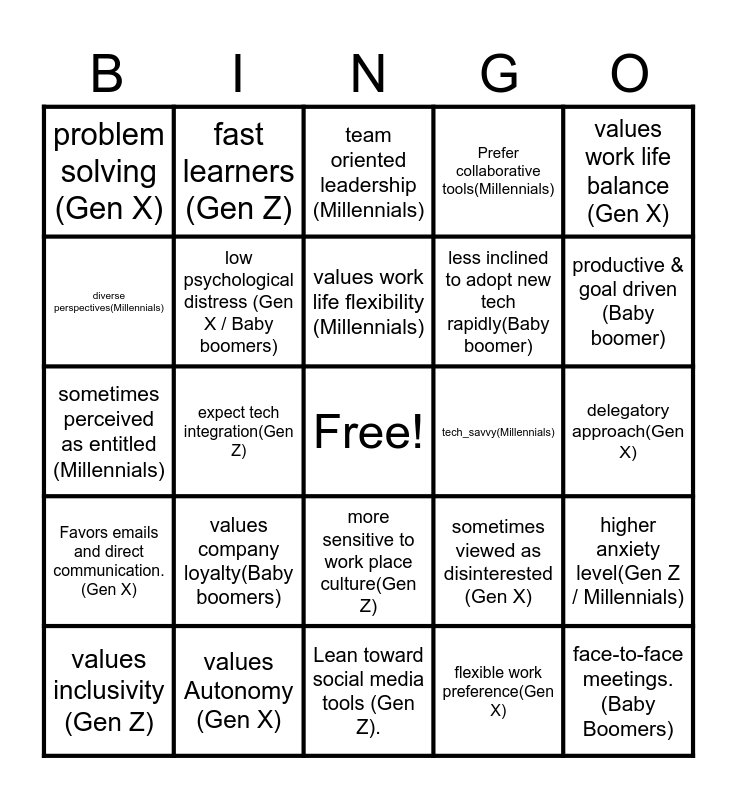 This bingo card has a free space and 24 words: values company loyalty(Baby boomers), values Autonomy (Gen X), values work life flexibility (Millennials), values inclusivity (Gen Z), values work life balance (Gen X), problem solving (Gen X), diverse perspectives(Millennials), fast learners (Gen Z), tech_savvy(Millennials), more sensitive to work place culture(Gen Z), less inclined to adopt new tech rapidly(Baby boomer), sometimes perceived as entitled (Millennials), sometimes viewed as disinterested (Gen X), higher anxiety level(Gen Z / Millennials), low psychological distress (Gen X / Baby boomers), flexible work preference(Gen X), delegatory approach(Gen X), team oriented leadership (Millennials), productive & goal driven (Baby boomer), expect tech integration(Gen Z), face-to-face meetings.(Baby Boomers), Favors emails and direct communication. (Gen X), Prefer collaborative tools(Millennials) and Lean toward social media tools (Gen Z)..