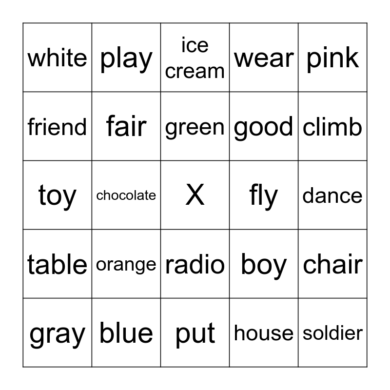 This bingo card has a free space and 24 words: orange, blue, green, gray, pink, white, friend, play, fly, radio, good, toy, boy, chair, fair, house, dance, ice cream, climb, chocolate, soldier, table, wear and put.