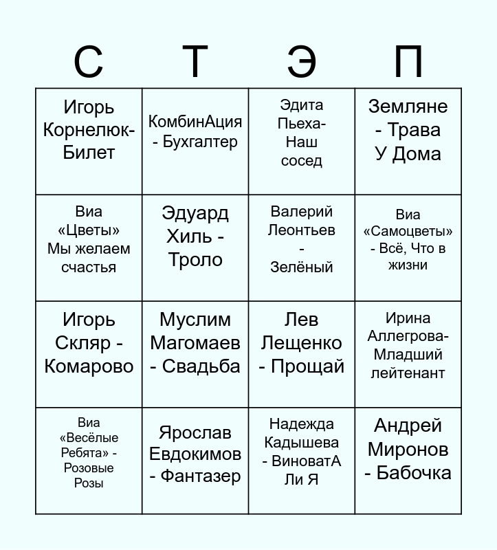 This bingo card has 16 words: Ярослав Евдокимов - Фантазер, Ирина Аллегрова-Младший лейтенант, Эдита Пьеха- Наш сосед, Игорь Корнелюк- Билет, Игорь Скляр - Комарово, КомбинАция - Бухгалтер, Лев Лещенко - Прощай, Надежда Кадышева - ВиноватА Ли Я, Виа «Цветы» Мы желаем счастья, Эдуард Хиль - Троло, Виа «Весёлые Ребята» - Розовые Розы, Земляне - Трава У Дома, Муслим Магомаев - Свадьба, Виа «Самоцветы» - Всё, Что в жизни, Валерий Леонтьев - Зелёный and Андрей Миронов - Бабочка.
