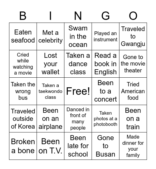 This bingo card has a free space and 37 words: Fallen asleep in class, Won a contest, Traveled with your friends, Lost your wallet, Been on a train, Been on an airplane, Taken a dance class, Taken a dance class, Traveled to Gwangju, Taken a judo class, Taken a taekwondo class, Played an instrument, Made dinner for your family, Tried American food, Cried while watching a movie, Traveled outside of Korea, Sung in front of the class, Swam in the ocean, Danced in front of many people, Been to a concert, Eaten seafood, Gone to the movie theater, Broken a bone, Been late for school, Studied all night, Gone to Busan, Met a celebrity, Lost your phone, Hiked up a mountain, Eaten Maratang, Sung at karaoke, Been on T.V., Taken the wrong bus, Gone to Seoul, Taken photos at a photobooth, Read a book in English and Studied a language other than English.