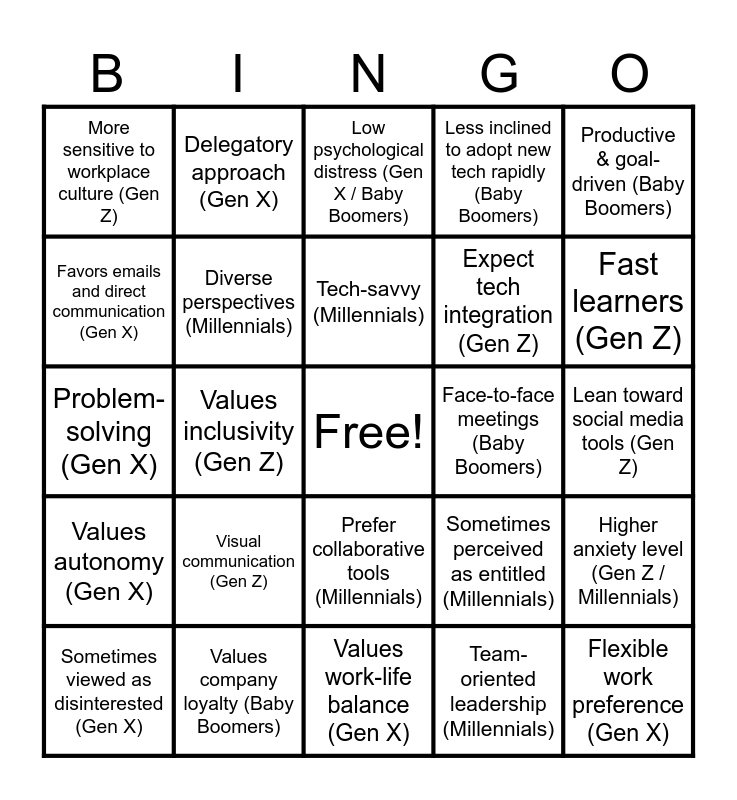 This bingo card has a free space and 25 words: Visual communication (Gen Z), Values work-life balance (Gen X), Tech-savvy (Millennials), Sometimes viewed as disinterested (Gen X), Productive & goal-driven (Baby Boomers), More sensitive to workplace culture (Gen Z), Favors emails and direct communication (Gen X), Delegatory approach (Gen X), Face-to-face meetings (Baby Boomers), Prefer collaborative tools (Millennials), Expect tech integration (Gen Z), Problem-solving (Gen X), Sometimes perceived as entitled (Millennials), Higher anxiety level (Gen Z / Millennials), Diverse perspectives (Millennials), Values work-life flexibility (Millennials), Lean toward social media tools (Gen Z), Low psychological distress (Gen X / Baby Boomers), Fast learners (Gen Z), Values inclusivity (Gen Z), Flexible work preference (Gen X), Values company loyalty (Baby Boomers), Values autonomy (Gen X), Less inclined to adopt new tech rapidly (Baby Boomers) and Team-oriented leadership (Millennials).