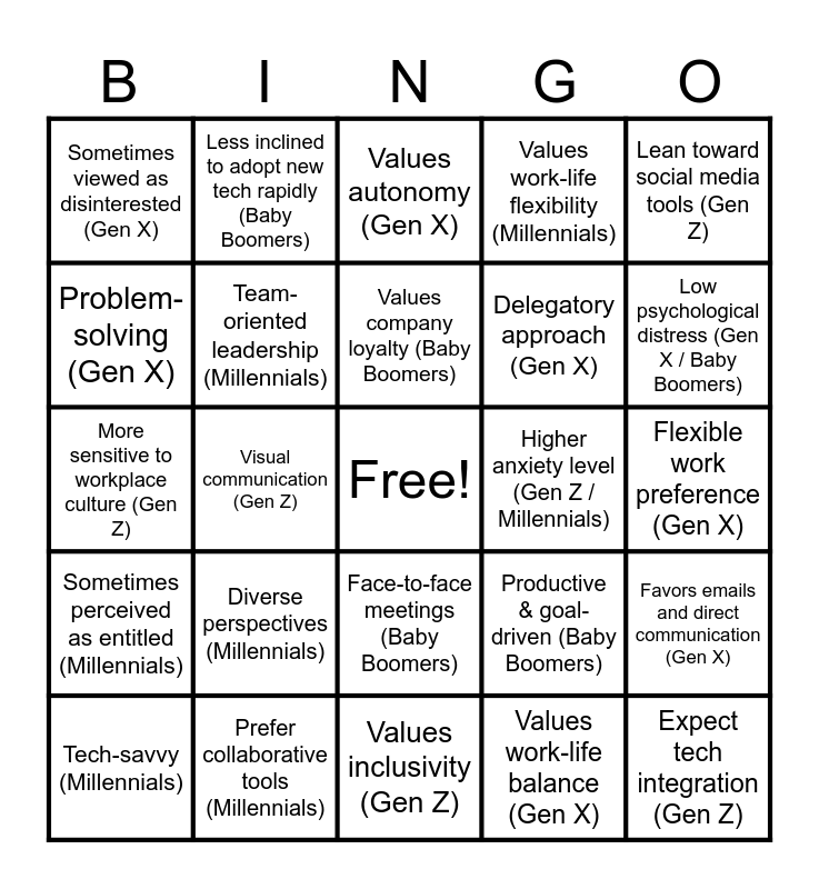 This bingo card has a free space and 25 words: Diverse perspectives (Millennials), Values inclusivity (Gen Z), Values company loyalty (Baby Boomers), Tech-savvy (Millennials), Lean toward social media tools (Gen Z), Sometimes viewed as disinterested (Gen X), Problem-solving (Gen X), Less inclined to adopt new tech rapidly (Baby Boomers), Higher anxiety level (Gen Z / Millennials), Face-to-face meetings (Baby Boomers), Delegatory approach (Gen X), More sensitive to workplace culture (Gen Z), Productive & goal-driven (Baby Boomers), Favors emails and direct communication (Gen X), Team-oriented leadership (Millennials), Fast learners (Gen Z), Flexible work preference (Gen X), Values autonomy (Gen X), Low psychological distress (Gen X / Baby Boomers), Visual communication (Gen Z), Expect tech integration (Gen Z), Prefer collaborative tools (Millennials), Sometimes perceived as entitled (Millennials), Values work-life flexibility (Millennials) and Values work-life balance (Gen X).