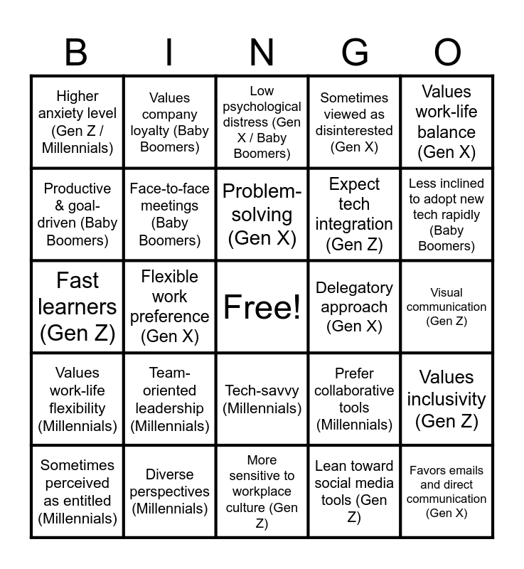This bingo card has a free space and 25 words: Team-oriented leadership (Millennials), More sensitive to workplace culture (Gen Z), Problem-solving (Gen X), Sometimes perceived as entitled (Millennials), Values work-life balance (Gen X), Higher anxiety level (Gen Z / Millennials), Productive & goal-driven (Baby Boomers), Values company loyalty (Baby Boomers), Delegatory approach (Gen X), Tech-savvy (Millennials), Expect tech integration (Gen Z), Fast learners (Gen Z), Prefer collaborative tools (Millennials), Values inclusivity (Gen Z), Face-to-face meetings (Baby Boomers), Values autonomy (Gen X), Visual communication (Gen Z), Low psychological distress (Gen X / Baby Boomers), Less inclined to adopt new tech rapidly (Baby Boomers), Flexible work preference (Gen X), Favors emails and direct communication (Gen X), Diverse perspectives (Millennials), Values work-life flexibility (Millennials), Sometimes viewed as disinterested (Gen X) and Lean toward social media tools (Gen Z).