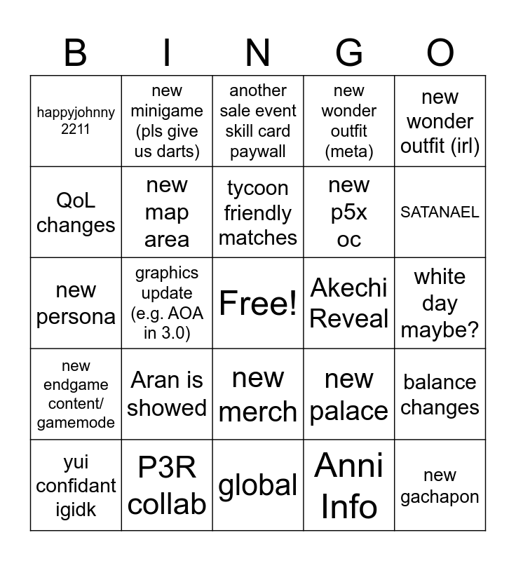 This bingo card has a free space and 24 words: Aran is showed, P3R collab, tycoon friendly matches, yui confidant igidk, new wonder outfit (irl), happyjohnny 2211, QoL changes, new minigame (pls give us darts), Akechi Reveal, new merch, new p5x oc, new persona, new palace, balance changes, new map area, Anni Info, white day maybe?, another sale event skill card paywall, SATANAEL, graphics update (e.g. AOA in 3.0), new gachapon, new endgame content/ gamemode, new wonder outfit (meta) and global.
