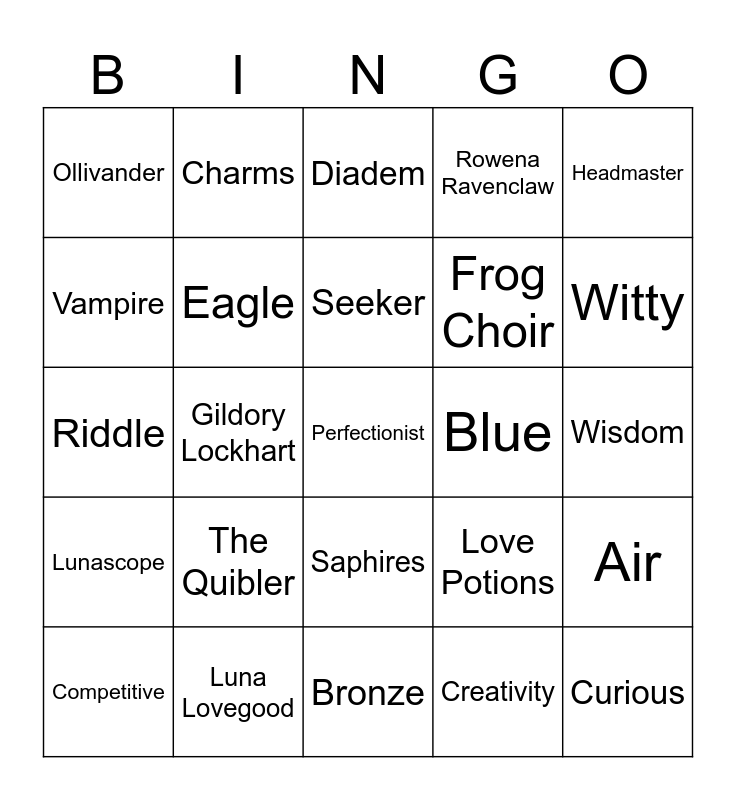 This bingo card has 30 words: Luna Lovegood, Moaning Myrtle, Gildory Lockhart, Professor Trelawny, Ollivander, Diadem, Eagle, Saphires, Blue, Bronze, Wisdom, Perfectionist, Creativity, Curious, Witty, Floo Powder, Love Potions, Lunascope, The Quibler, Headmaster, Riddle, The Grey Lady, Charms, Frog Choir, Vampire, Rowena Ravenclaw, Air, Competitive, Seeker and Augureys.
