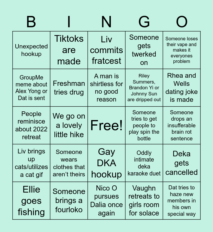 This bingo card has a free space and 24 words: Someone wears clothes that aren’t theirs, Someone brings a fourloko, A man is shirtless for no good reason, Ellie goes fishing, Someone loses their vape and makes it everyones problem, Unexpected hookup, GroupMe meme about Alex Yong or Dat is sent, Tiktoks are made, Someone tries to get people to play spin the bottle, Gay DKA hookup, Riley Summers, Brandon Yi or Johnny Sun are dripped out, People reminisce about 2022 retreat, Oddly intimate deka karaoke duet, Deka gets cancelled, Freshman tries drug, Vaughn retreats to girls room for solace, Someone drops an insufferable brain rot sentence, Liv commits fratcest, Rhea and Wells dating joke is made, We go on a lovely little hike, Dat tries to haze new members in his own special way, Liv brings up cats/utilizes a cat gif, Someone gets twerked on and Nico O pursues Dalia once again.