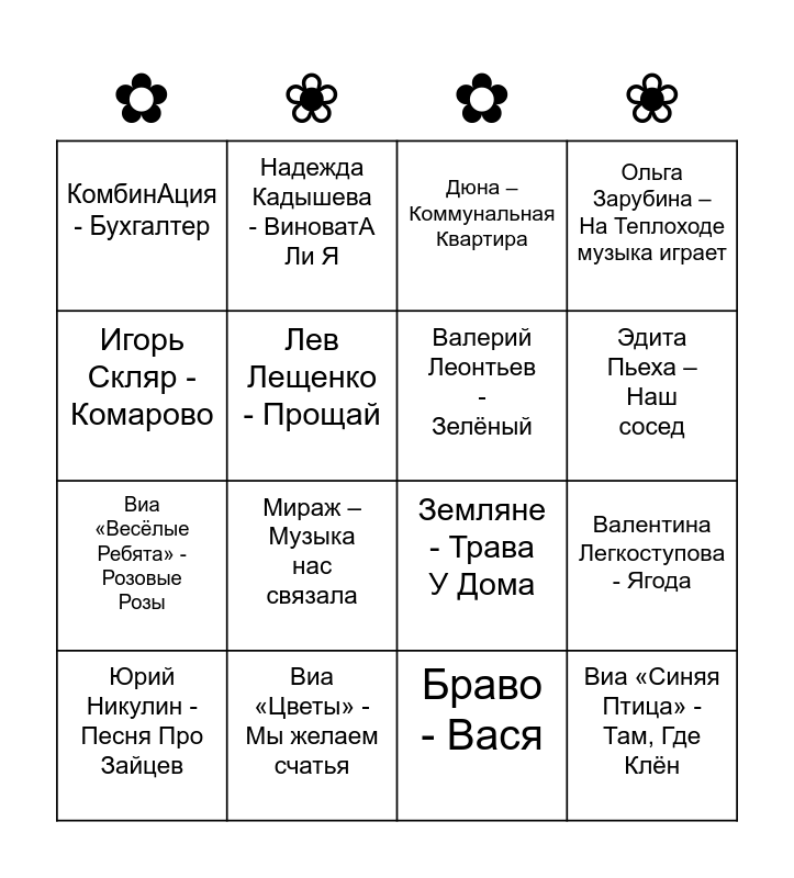 This bingo card has 24 words: Ярослав Евдокимов - Фантазер, Ирина Аллегрова – Младший лейтенант, Эдита Пьеха – Наш сосед, Игорь Корнелюк Билет, Игорь Скляр - Комарово, КомбинАция - Бухгалтер, Лев Лещенко - Прощай, Надежда Кадышева - ВиноватА Ли Я, Виа «Цветы» - Мы желаем счатья, Эдуард Хиль - Троло, Виа «Весёлые Ребята» - Розовые Розы, Земляне - Трава У Дома, Муслим Магомаев - Свадьба, Виа «Самоцветы» - Всё, Что в жизни, Валерий Леонтьев - Зелёный, Андрей Миронов - Бабочка, Браво - Вася, Дюна – Коммунальная Квартира, Мираж – Музыка нас связала, Валентина Легкоступова - Ягода, Юрий Никулин - Песня Про Зайцев, Виа «Синяя Птица» - Там, Где Клён, Ольга Зарубина – На Теплоходе музыка играет and Юрий Антонов – Мечта Сбывается.