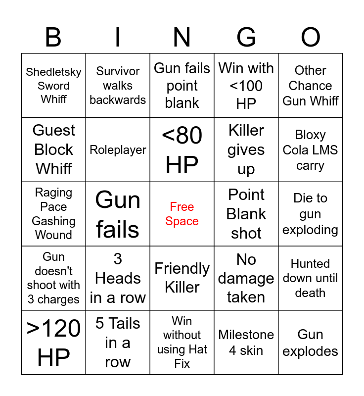 This bingo card has a free space and 24 words: 3 Heads in a row, 5 Tails in a row, <80 HP, >120 HP, Other Chance Gun Whiff, Shedletsky Sword Whiff, Guest Block Whiff, Survivor walks backwards, Point Blank shot, Friendly Killer, Killer gives up, Raging Pace Gashing Wound, No damage taken, Hunted down until death, Roleplayer, Milestone 4 skin, Die to gun exploding, Gun fails point blank, Bloxy Cola LMS carry, Gun fails, Gun explodes, Gun doesn't shoot with 3 charges, Win with <100 HP and Win without using Hat Fix.