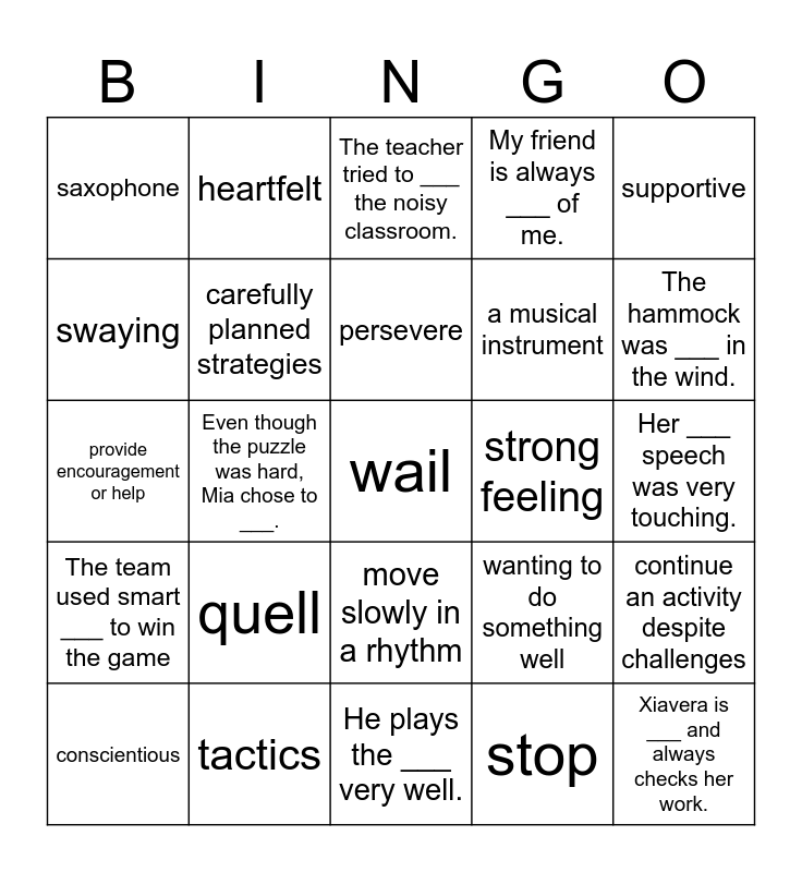 This bingo card has a free space and 24 words: quell, tactics, persevere, conscientious, supportive, saxophone, swaying, heartfelt, strong feeling, move slowly in a rhythm, a musical instrument, provide encouragement or help, wanting to do something well, continue an activity despite challenges, carefully planned strategies, stop, Her ___ speech was very touching., The teacher tried to ___ the noisy classroom., The hammock was ___ in the wind., Even though the puzzle was hard, Mia chose to ___., Xiavera is ___ and always checks her work., The team used smart ___ to win the game, My friend is always ___ of me. and He plays the ___ very well..