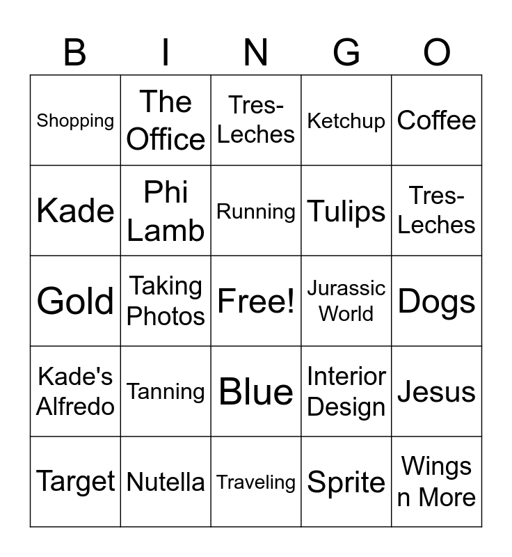 This bingo card has a free space and 24 words: Tanning, Nutella, Running, Target, Coffee, Shopping, Kade, The Office, Jurassic World, Blue, Tulips, Gold, Interior Design, Jesus, Phi Lamb, Sprite, Dogs, Tres-Leches, Tres-Leches, Taking Photos, Wings n More, Kade's Alfredo, Ketchup and Traveling.