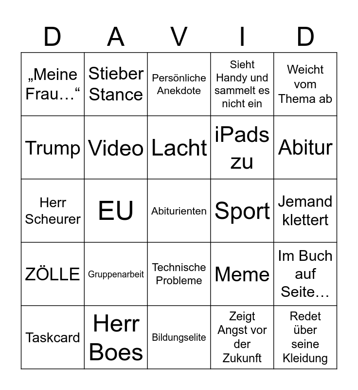 This bingo card has a free space and 24 words: Gruppenarbeit, Herr Boes, Lacht, Taskcard, Weicht vom Thema ab, „Meine Frau…“, Trump, Stieber Stance, Sport, Technische Probleme, iPads zu, Herr Scheurer, Meme, Im Buch auf Seite…, Video, Zeigt Angst vor der Zukunft, Jemand klettert, Persönliche Anekdote, Abitur, EU, Redet über seine Kleidung, ZÖLLE, Sieht Handy und sammelt es nicht ein and Bildungselite.