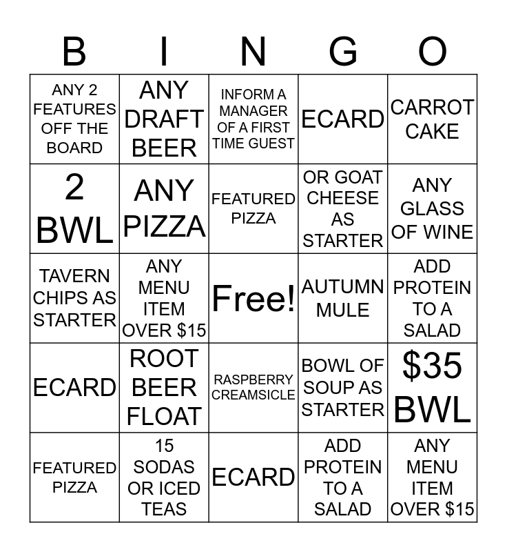 This bingo card has a free space and 24 words: ROOT BEER FLOAT, 15 SODAS OR ICED TEAS, FEATURED PIZZA, FEATURED PIZZA, CARROT CAKE, ANY 2 FEATURES OFF THE BOARD, 2 BWL, ANY DRAFT BEER, AUTUMN MULE, RASPBERRY CREAMSICLE, OR GOAT CHEESE AS STARTER, TAVERN CHIPS AS STARTER, BOWL OF SOUP AS STARTER, $35 BWL, ANY PIZZA, ADD PROTEIN TO A SALAD, ADD PROTEIN TO A SALAD, INFORM A MANAGER OF A FIRST TIME GUEST, ANY GLASS OF WINE, ANY MENU ITEM OVER $15, ANY MENU ITEM OVER $15, ECARD, ECARD and ECARD.